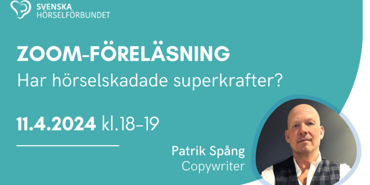 Den 11.4.2024 kl. 18-19 ordnar förbundet Zoom-föreläsningen Har hörselskadade superkrafter?. Detta är första delen av en föreläsningsserie med diskussionsgrupp efteråt som riktar sig till alla i yrkesverksam ålder och andra intresserade. Föreläsningen skrivtolkas. Föreläsare Patrik Spång är en prisbelönad copywriter…