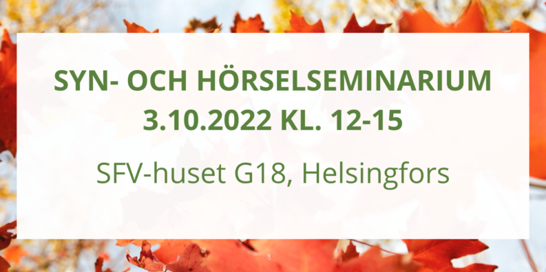 Den 3.10.2022 ordnar Svenska hörselförbundet ett seminarium med högaktuella föreläsningar angående syn, hörsel och välmående. Seminariet hålls vid SFV-huset G18 i Helsingfors. Under dagen finns det även möjlighet att bekanta sig med hjälpmedel, delta i tävlingar och få mer information…