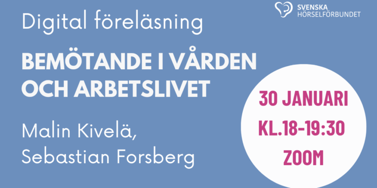 Välkommen på Svenska hörselförbundets digitala föreläsning ”Bemötande i vården och arbetslivet” torsdagen 30 januari kl 18-19.30. Föreläsningen hålls via Zoom och skrivtolkas. Som föreläsare fungerar Malin Kivelä och Sebastian Forsberg. Malin Kivelä och Sebastian Forsberg gjorde båda sina examensarbeten på Yrkeshögskolan…