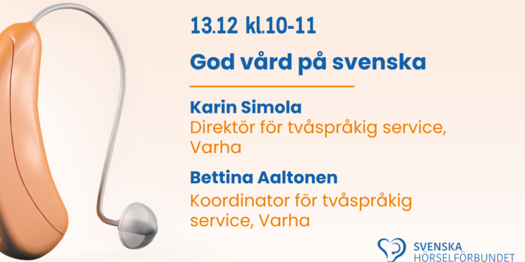 Fredagen den 13.12 kl.10-11 ordnar förbundet femte och sista delen av föreläsningsserien Vilse på vårdstigen. Temat för detta tillfälle är svenskan i vården. Passa på att komma och ställa frågor och diskutera egna erfarenheter kring svenskspråkig service! Tillfället hålls på…