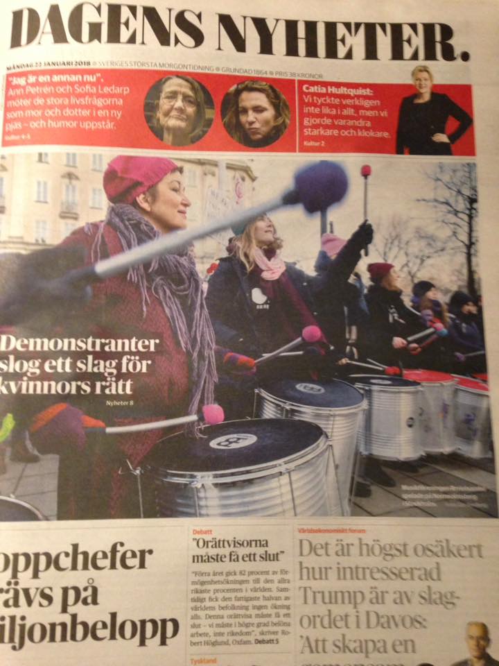 Efter några månaders kurs fick vi vara med på spelningar. Ni kanske har glömt men 2017-2018 präglades i hög grad av Metoo-rörelsen. Det ordnades kvinnomarscher över hela världen och folk stickade rosa ”pussy hats”. Det känns nu som väldigt länge sen men tro mig att det var fantastiskt att vara mitt uppe i det och samtidigt spela i feministisk sambaorkester. Min allra första spelning var just på kvinnomarschen i Stockholm 21 januari 2018 och därav kom det sig att jag – iklädd pussy hat – för första och förmodligen enda gången i mitt liv hamnade på Dagens Nyheters förstasida.
