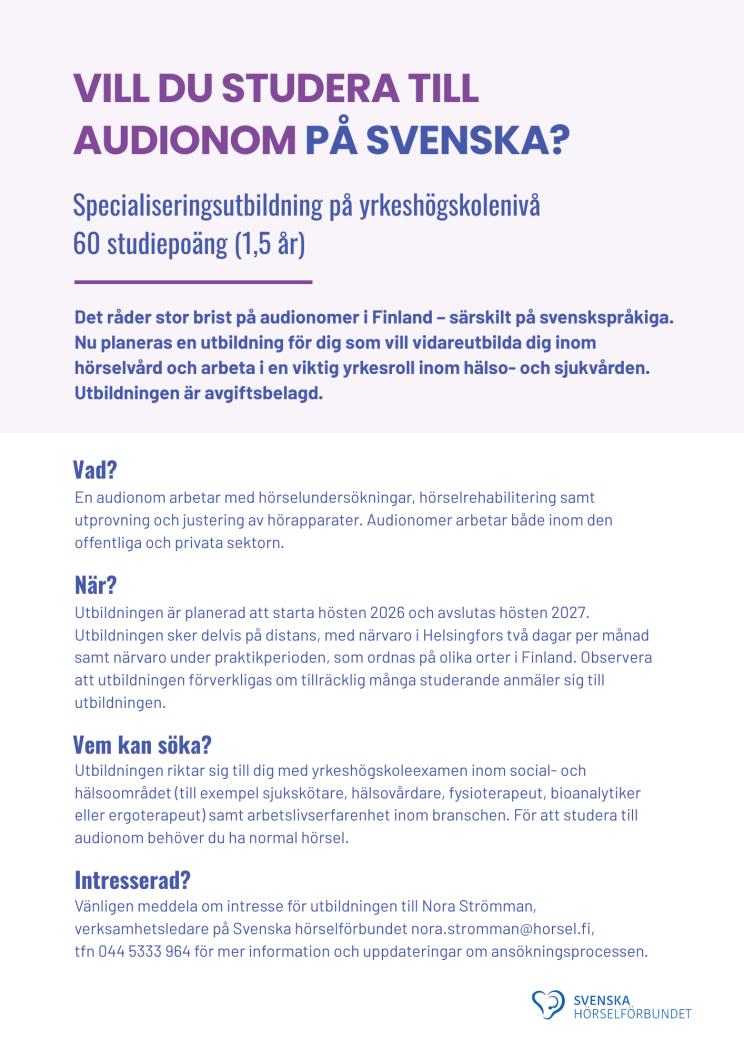 Det råder stor brist på audionomer i Finland – särskilt på svenskspråkiga. Nu planeras en utbildning för dig som vill vidareutbilda dig inom hörselvård och arbeta i en viktig yrkesroll inom hälso- och sjukvården. En audionom arbetar med hörselundersökningar, hörselrehabilitering samt utprovning och justering av hörapparater. Audionomer arbetar både inom den offentliga och privata sektorn.